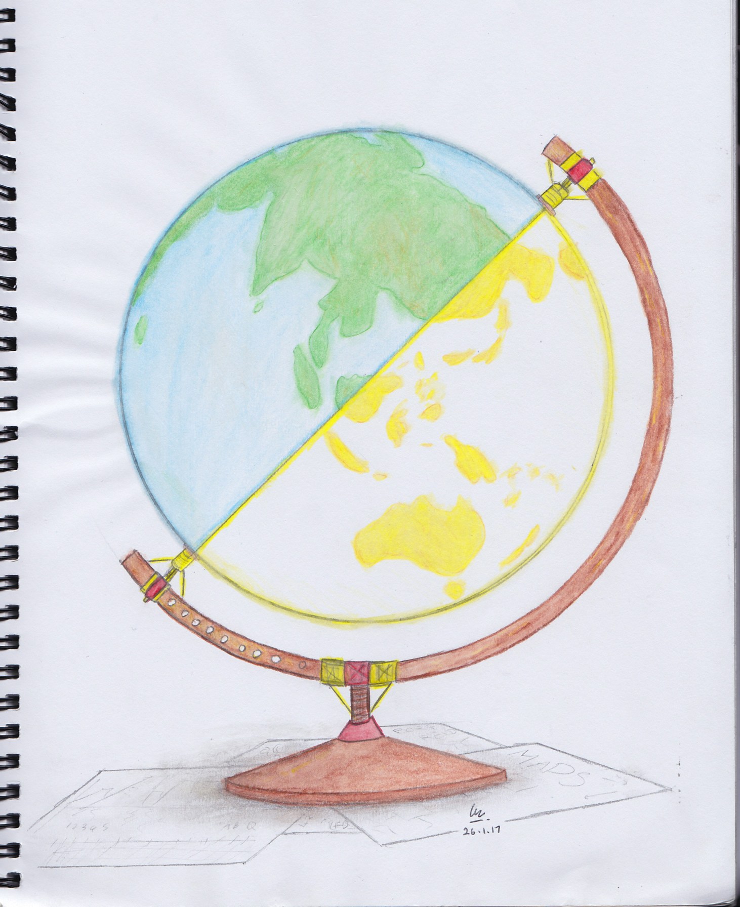 Very nice artwork and paragraph; I really like how the papers act as a platform for the globe. Also, the shadow effect at the bottom is the perfect accent to the drawing, did you use charcoal or just smudge pencil?